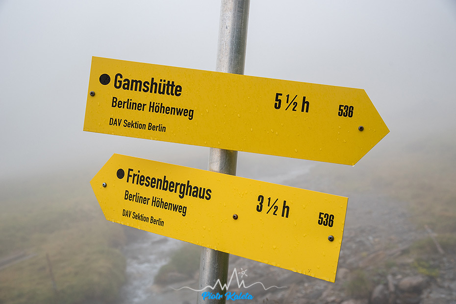 Wg mapy ma być teraz przez jakiś czas relatywnie płasko i w sumie jest – tyle, że po kamieniach. Tak dokładnie to przechodzi się przez znakowane gołoborze – nawet z kijkami męczący teren, na nasze szczęście teraz jednak suchy. Pod koniec gołoborza ścieżka idzie ostrzej w górę i dość szybko urabiamy dobrych 1oo metrów wysokości. Znów mijamy kolejnych turystów a BHW przez kilkaset metrów idzie trawersem. Trawers kończy się kolejnym pionowym odcinkiem szlaku – urabia się gdzieś 5om wysokości klucząc po takim parchatym skalno-ziemnym zboczu. Później znów teren się wypłaszcza. Gdy wcześniej przeglądałem mapę to coś mi się pomieszało bo byłem przekonany, że przy leżącym przed nami poniżej Wesendlkarsee jest już nasze schronisko. Błąd, co więcej – rozczarowujący błąd. Przed nami widać, że teraz czeka nas lekkie podejście, po nim trawers. Widać jednak drogowskaz: do schroniska zostało 3o minut, no to spinamy się i znów powoli człapiemy. BHW kluczy tu specyficznie ale w końcu z chmur wyłania się Friesenberghaus. W chwilowych przejaśnieniach i z dużą ulgą stajemy przed wejściem : )