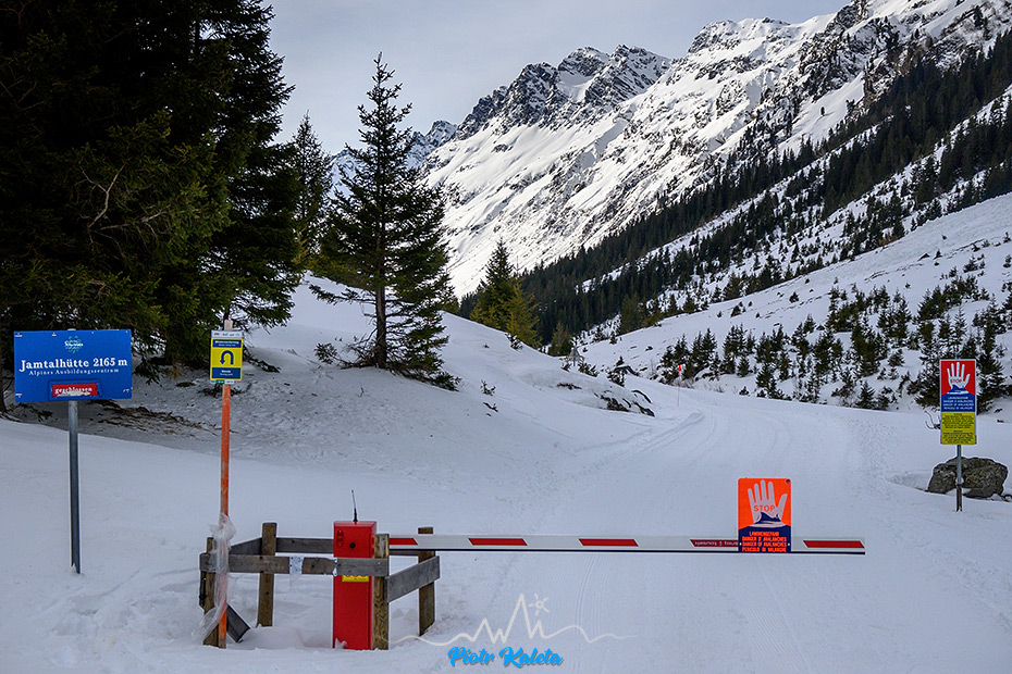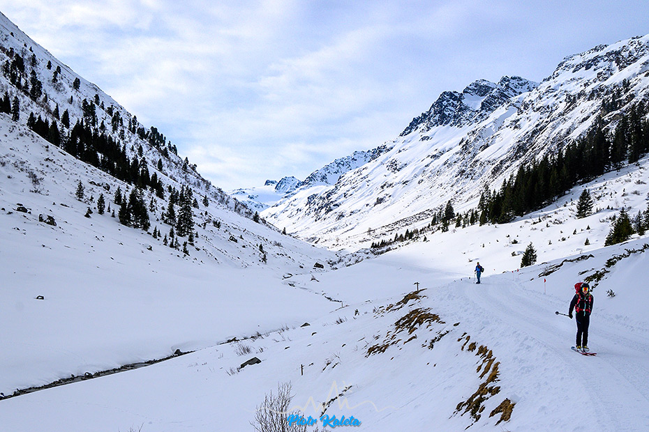 Podejście jest zaskakująco długie i nudne. Zaskakująco bo choć mierzyłem odległości na mapie to w realu jest to inaczej odczuwalne. Nasz pierwotny cel czyli tura na Schnapfenspitze (3219 m) okazuje się być zupełnym niewypałem – po jakichś 8 km dreptania i minięciu łącznie 14 skiturowców śpiących zapewne w winterraumie i zjeżdżających do Galtur – okazuje się, że nie ma śladu podejścia, nie ma też śladu w którym moglibyśmy sami spróbować : (