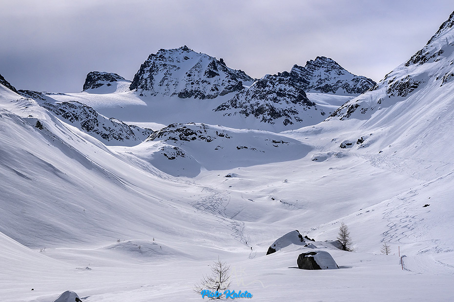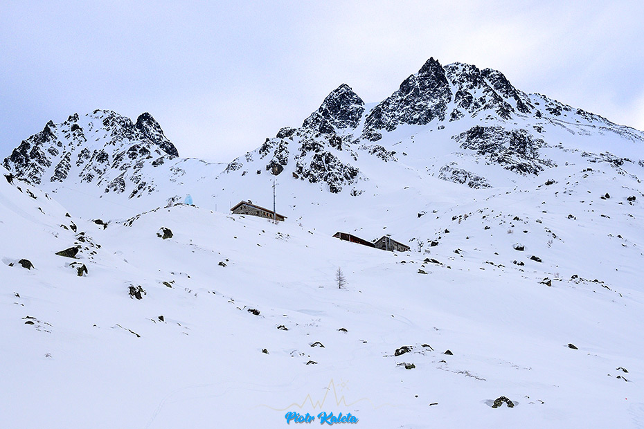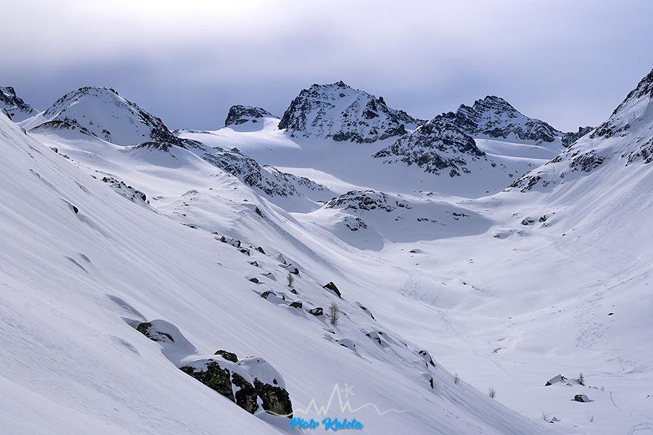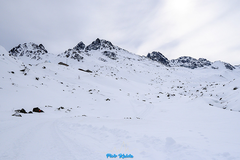 Z dostępnych opcji wybieramy powrót do doliny by kontynuować dreptanie w jej górną część. Wysokość zdobywa się powoli – obaj czujemy w nogach to naprawdę długie podejście. Celujemy niedaleko bo tylko we wzniesienie przegradzające w tym miejscu dolinę. W połowie drogi wymiękam – mam naprawdę dość na dziś – znaczy ma moja prawa pięta – obtarcie. Co prawda nie na tyle poważne by nie iść wyżej, ale na tyle poważne by jak się pójdzie wyżej skasować sobie jutrzejszy dzień. Proponuję Łukaszowi by poszedł na tę bałuchę sam a ja na niego poczekam u jej podstawy. Idzie powoli bo do opuszczenia schroniska ma znów problemy z przyklejającym się do fok śniegiem. Już po tym jak zaczynamy zjazd tak by na pożegnanie chmury się trochę rozstępują i widoki robią się całkiem – całkiem.