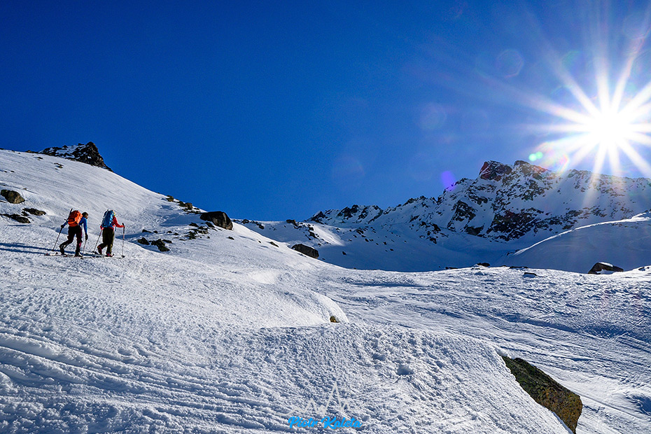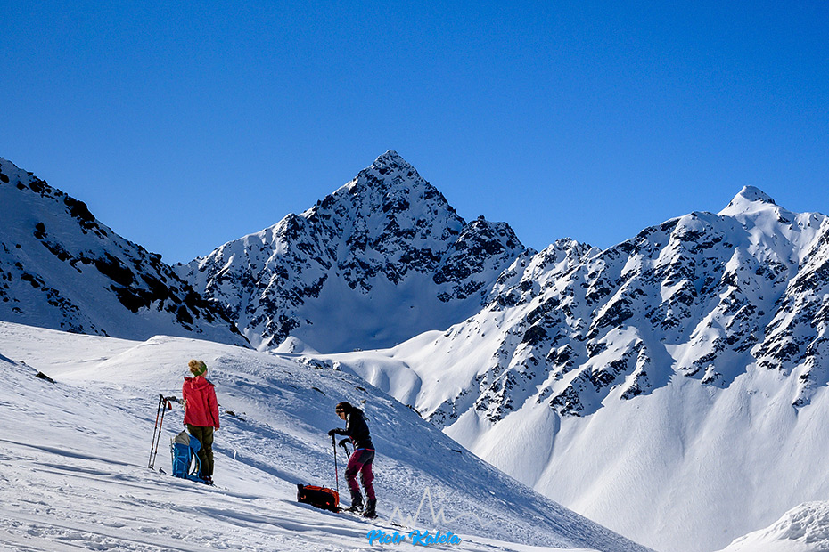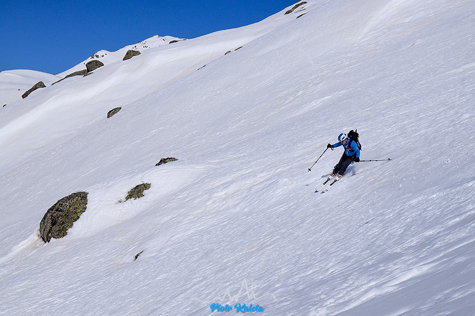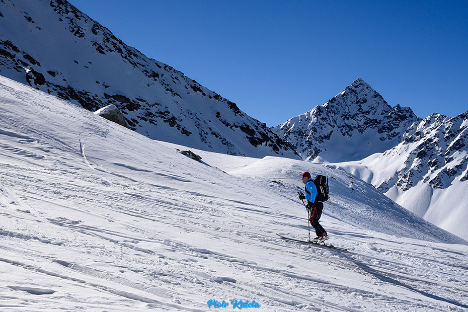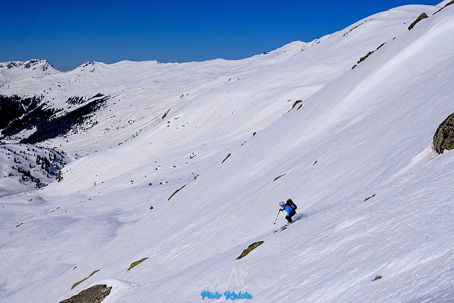 Dalej ślady dalej trawersują zbocza Flüela Wisshorn co zastanawiamy się nad alternatywami dla zjazdu w okolicy podejścia. Ostatecznie niczego nie wymyślamy : (