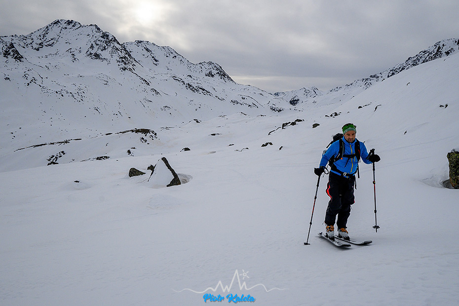 Michał napiera dalej, ale nieco poniżej szczytu i tak odpuszcza przepinając się do zjazdu w wyjątkowo wrednym miejscu. W międzyczasie albo obserwuję jak mu idzie albo miotam się między skrajnymi skałami siodełka by poprzyglądać się widokowi na sąsiednie doliny z nowej perspektywy. A jest na co 🙂 No i nowy teren to nowe pomysły he he 🙂 Do zjazdu śnieg trafia się za to najfajniejszy na całym wyjeździe – nieco poniżej przełączki ofkors. Dzięki czemu (i dzięki podpowiedzi Michała obserwującego moje “poczynania” 😉 ), bazgroły jakie pozostawiam na stoku zaczynają zbliżać się do kaligrafii 😉