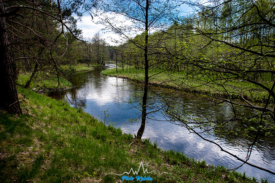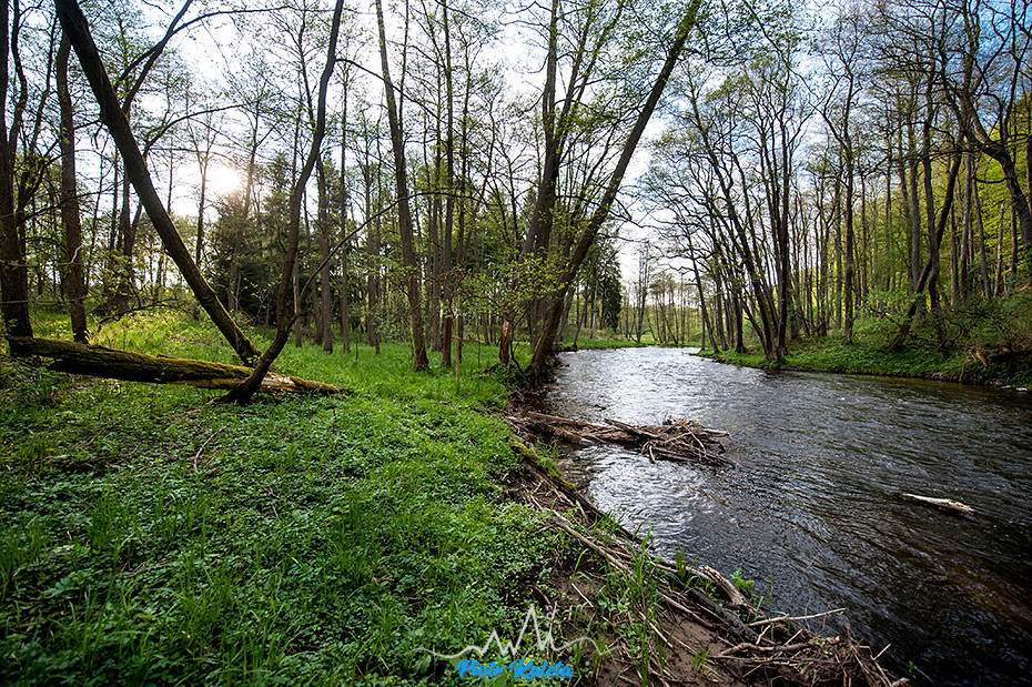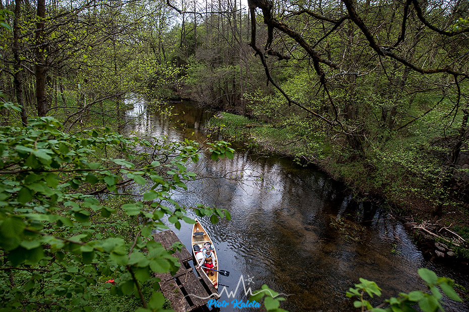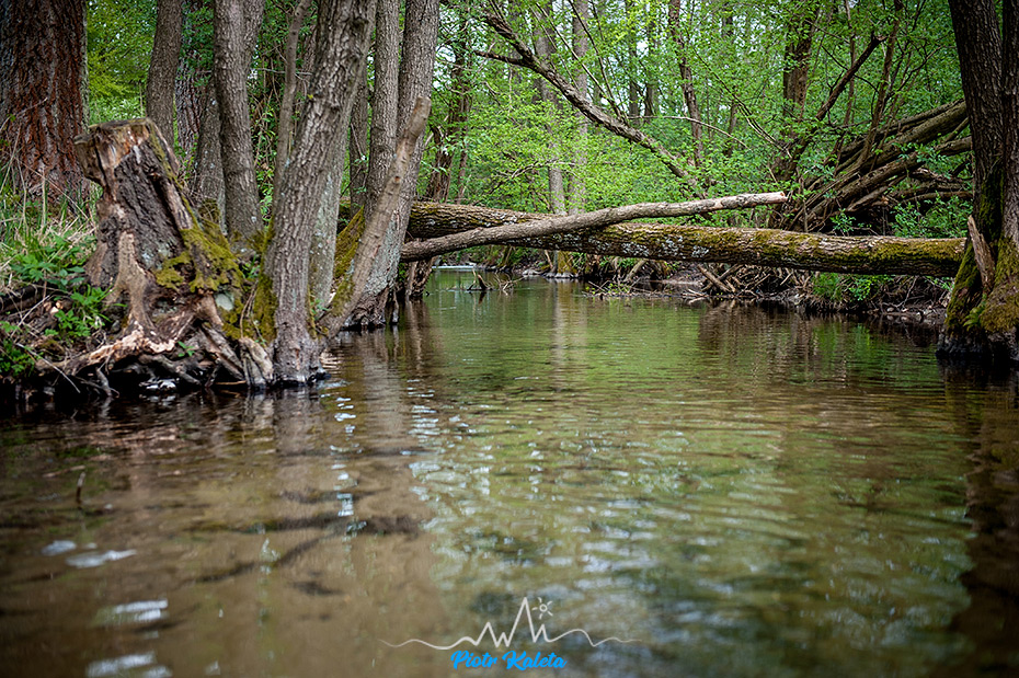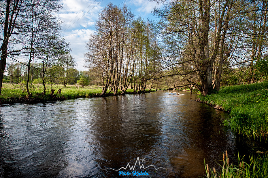 Jeszcze nie wiemy, że olsy porastające brzegi i ślady po bobrzych zębach będą nam towarzyszyć do samego końca spływu. Poza tym wody na tym odcinku jest tyle, że wiosło rzadko zanurza się na całe pióro. Jakoś nam to nie przeszkadza – wioseł i tak używamy tylko do korekt kursu, poza tym po prostu dajemy się nieść rzece i się otulić klimatem tego miejsca.