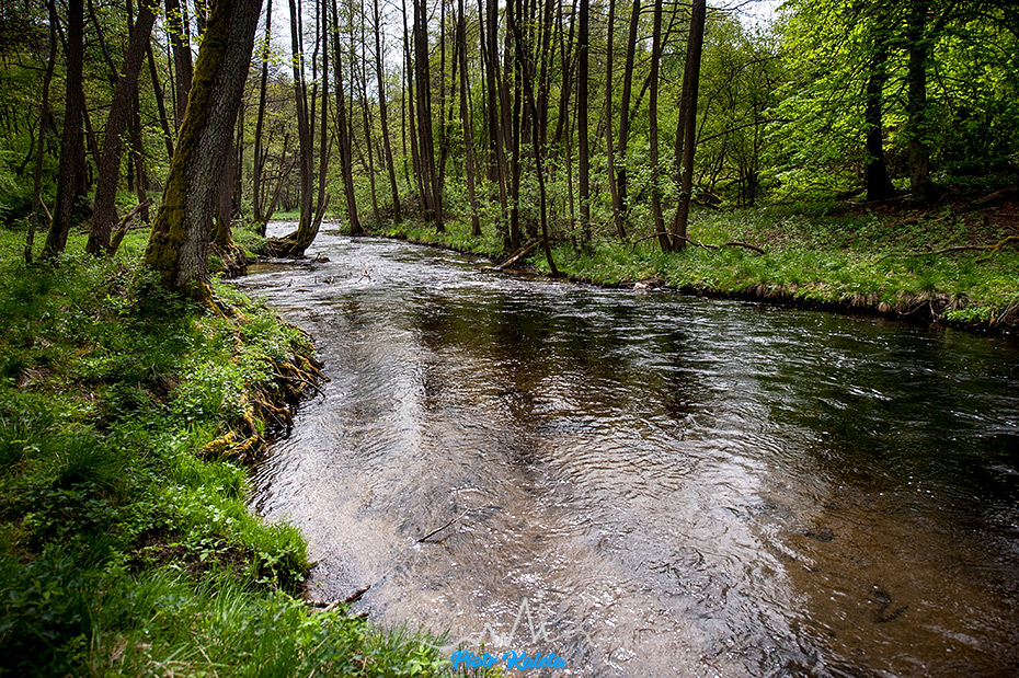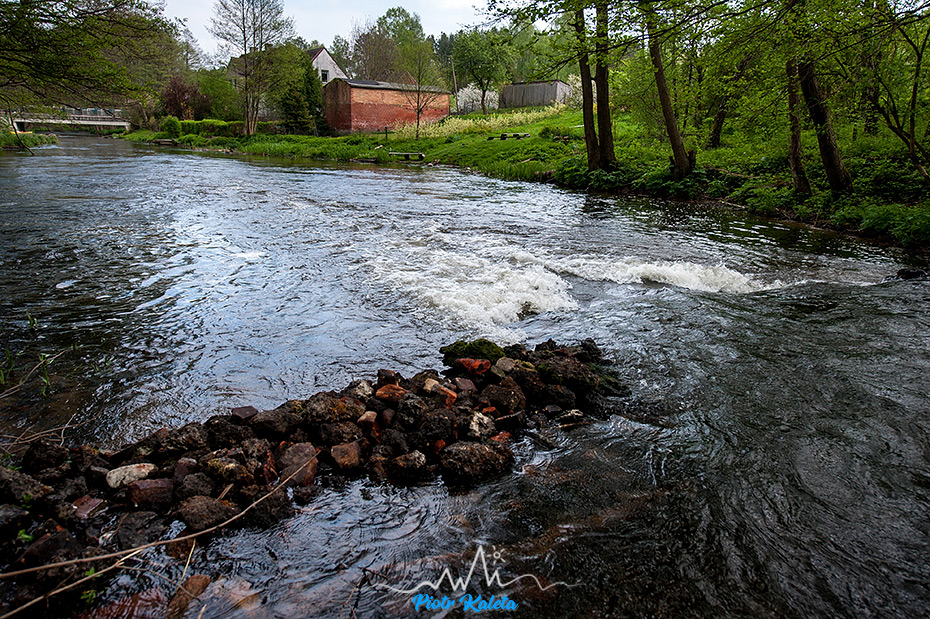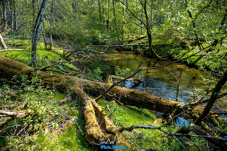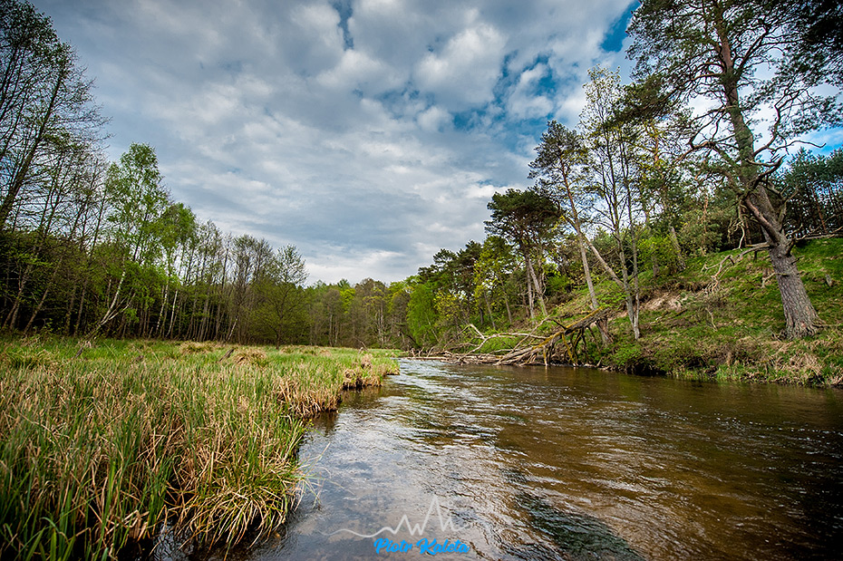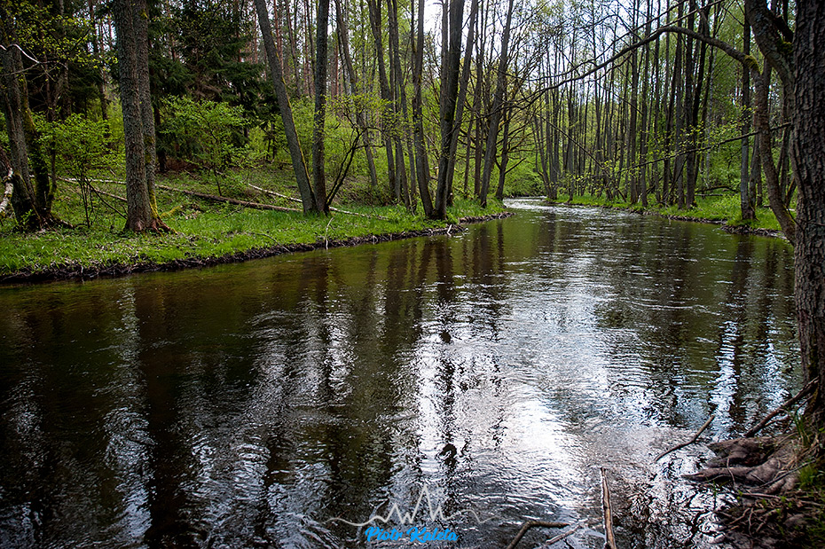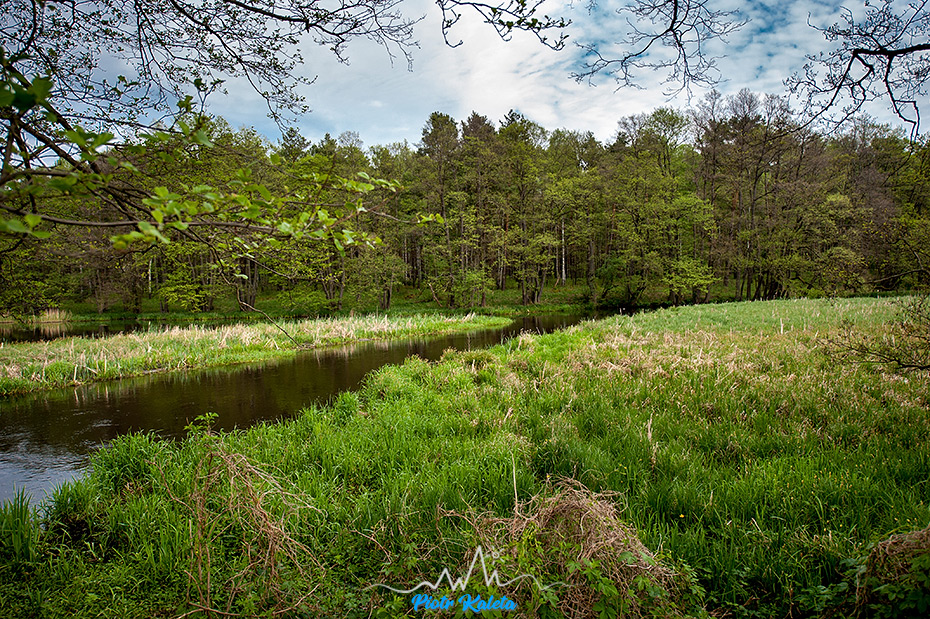 Jeszcze nie wiemy, że olsy porastające brzegi i ślady po bobrzych zębach będą nam towarzyszyć do samego końca spływu. Poza tym wody na tym odcinku jest tyle, że wiosło rzadko zanurza się na całe pióro. Jakoś nam to nie przeszkadza – wioseł i tak używamy tylko do korekt kursu, poza tym po prostu dajemy się nieść rzece i się otulić klimatem tego miejsca.