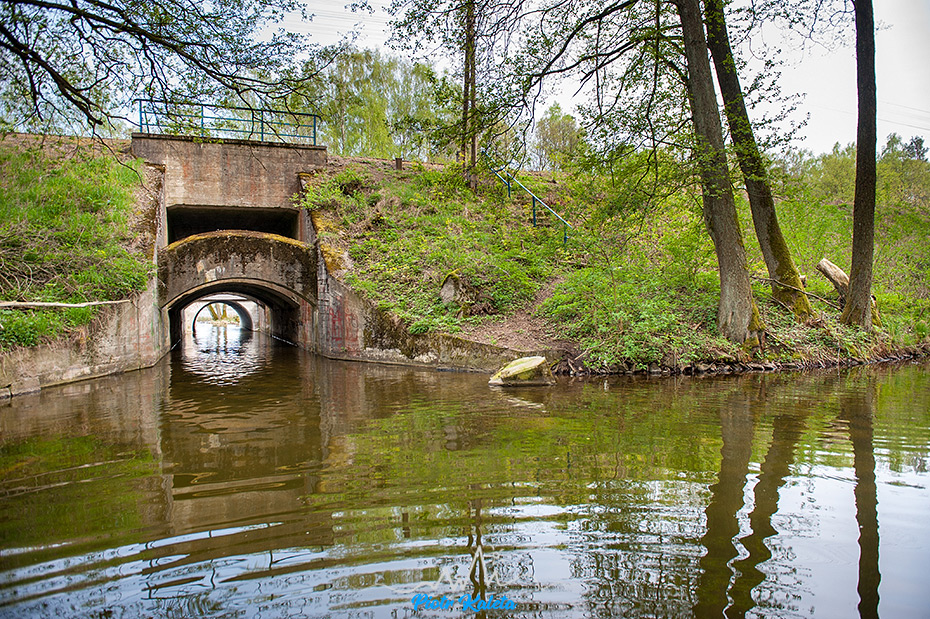 Końcówka (65,6) kanału łączącego Jeziora Kocie i Pile to kawał solidnej niemieckiej roboty i prezentuje się tak jak powyżej. Pierwotnie mieliśmy zawinąć do Bornego Sulinowa, ale w trakcie pływania dochodzimy do wniosku, że odpuszczamy i ostatecznie płyniemy dalej. A jak tak, to wieś Piławę pozostawiamy z lewej burty i przy lekkim bocznym wietrze kierujemy się na widoczną z daleka wieżę obserwacyjną. Ten fragment spływu to jak na razie jedyny w którym fale są na tyle duże, że kanu zaczyna się lekko kołysać. Po nieco ponad dwóch kilometrach tego przyjemnego bujania opuszczamy jezioro mijając (63,2) po lewej stronie pole kempingowe okupowane przez kilka camperów i kilkanaście namiotów. Rzeka w tym miejscu to w zasadzie ponownie kanał, tyle, że tym razem nurt jest lekko wyczuwalny.