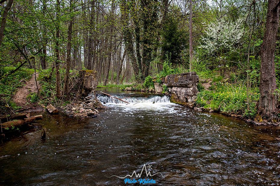 Pierwotnie – po rozpoznaniu z brzegu miałem w tym miejscu spławić kanu (bo szkoda mi było je mocno poobijać), ale w czasie podpływania do mostku pojawia się jakiś impuls a z nim decyzja – spróbuję spłynąć. Między kamieniami a burtami jest może 15-2ocm przestrzeni, ale szczęśliwie udaje mi się zygzakiem ominąć przeszkody. Zaskakujący “problem” pojawia się kilkanaście metrów dalej – prąd jest tak silny, że mam problem z wyhamowaniem i zabraniem z tego miejsca robiącej mi w czasie tej operacji zdjęcia Magdy. Jakoś się udaje. Po kilkudziesięciu metrach prąd zwalnia i w końcu można na spokojnie przyjrzeć się rzece.