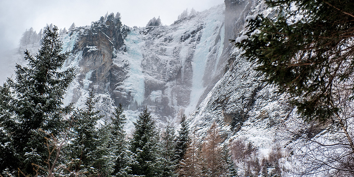 Proszę wycieczki: na lewo “Eiszwillinge” (WI 3-4, przewodnikowe 6om, ale ewidentnie prawy bliźniak wylał znacznie obficiej niż to widać w przewodniku) na prawo “Angst vor Lust” (WI 3-6+ / M6+, 15om).